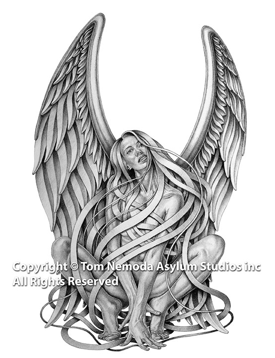 Angel on a Pedestal is a figure drawing of a beautiful Angel with stylized wings. Set in a fanciful setting to create an otherworldly feel.