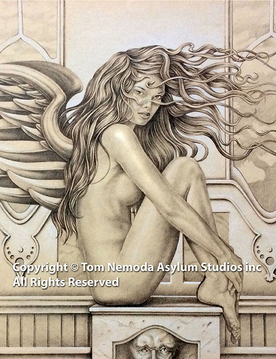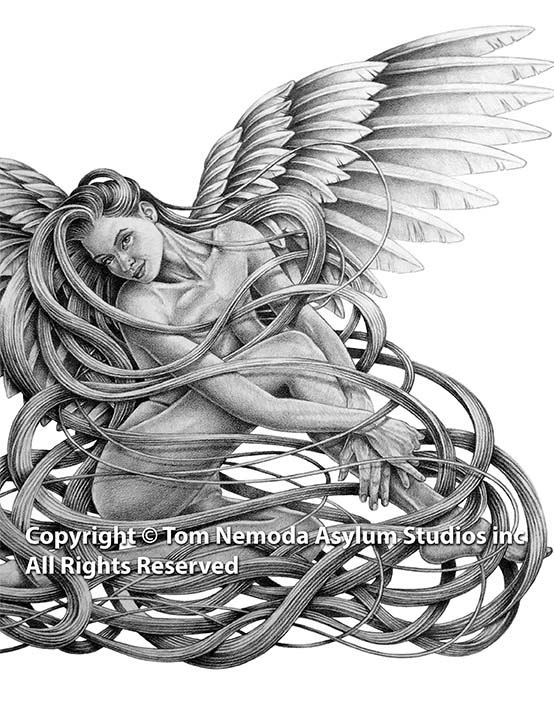 Winged Warrior is a figure drawing of a beautiful warrior Angel. She is down but not out. The art work shows the warrior Angle using her shield to rise to do battle.